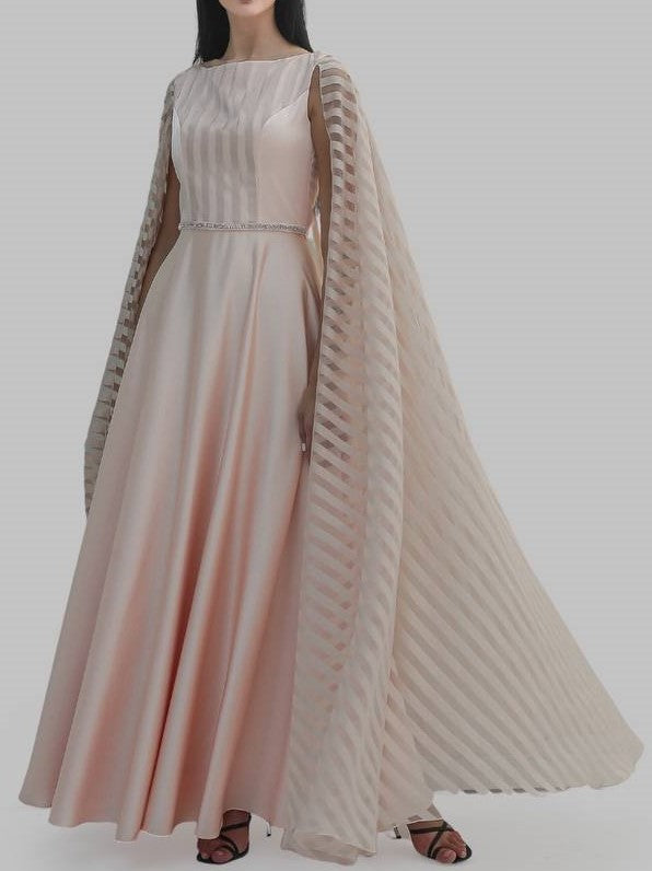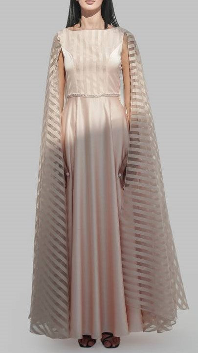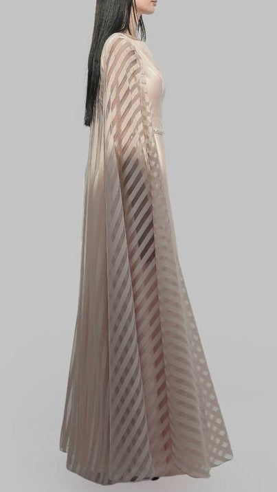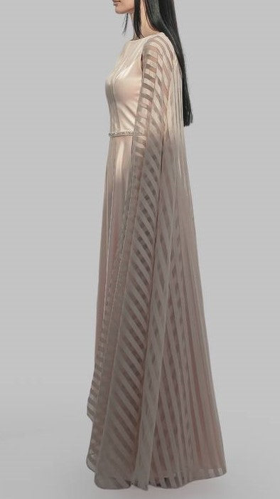 A royal dress made of elegant striped organza and elegant soft fabric. The design is the pinnacle of elegance and supreme beauty. The chest is made of two types of fabric. Long sleeves of striped organza flowing in the form of large wings. Below the chest is a fixed belt decorated with luxurious beads. Suitable for high-end evening parties