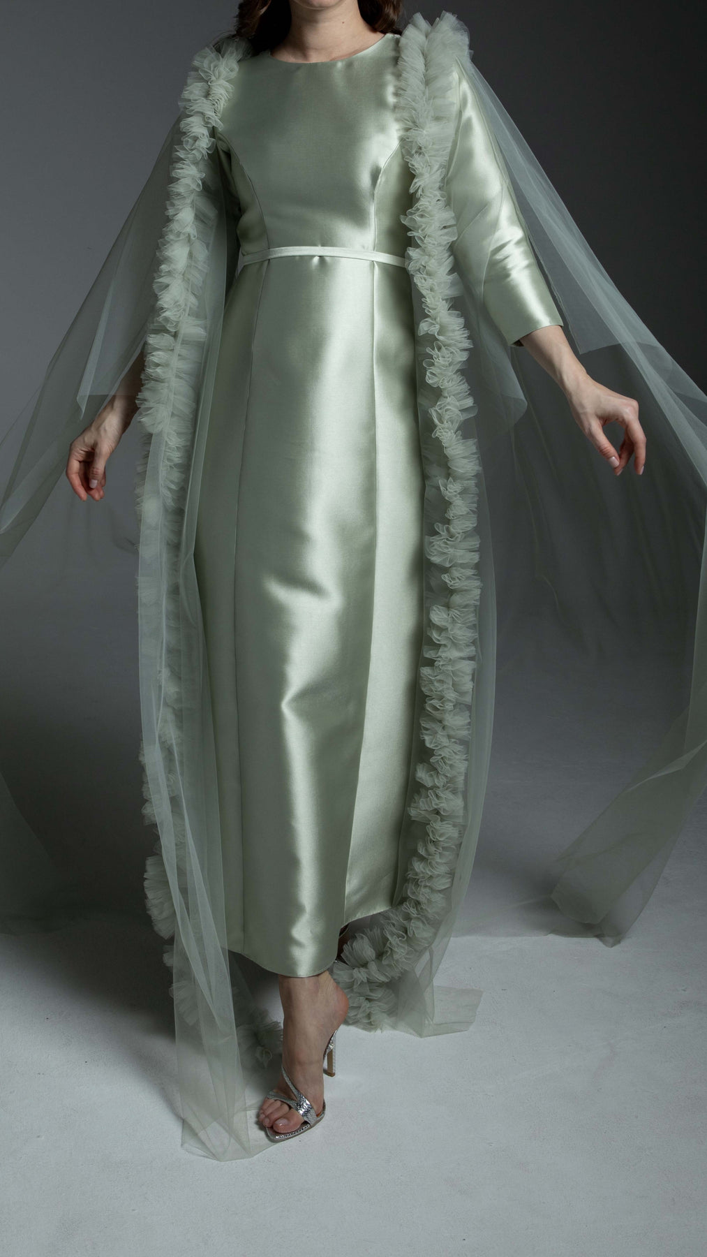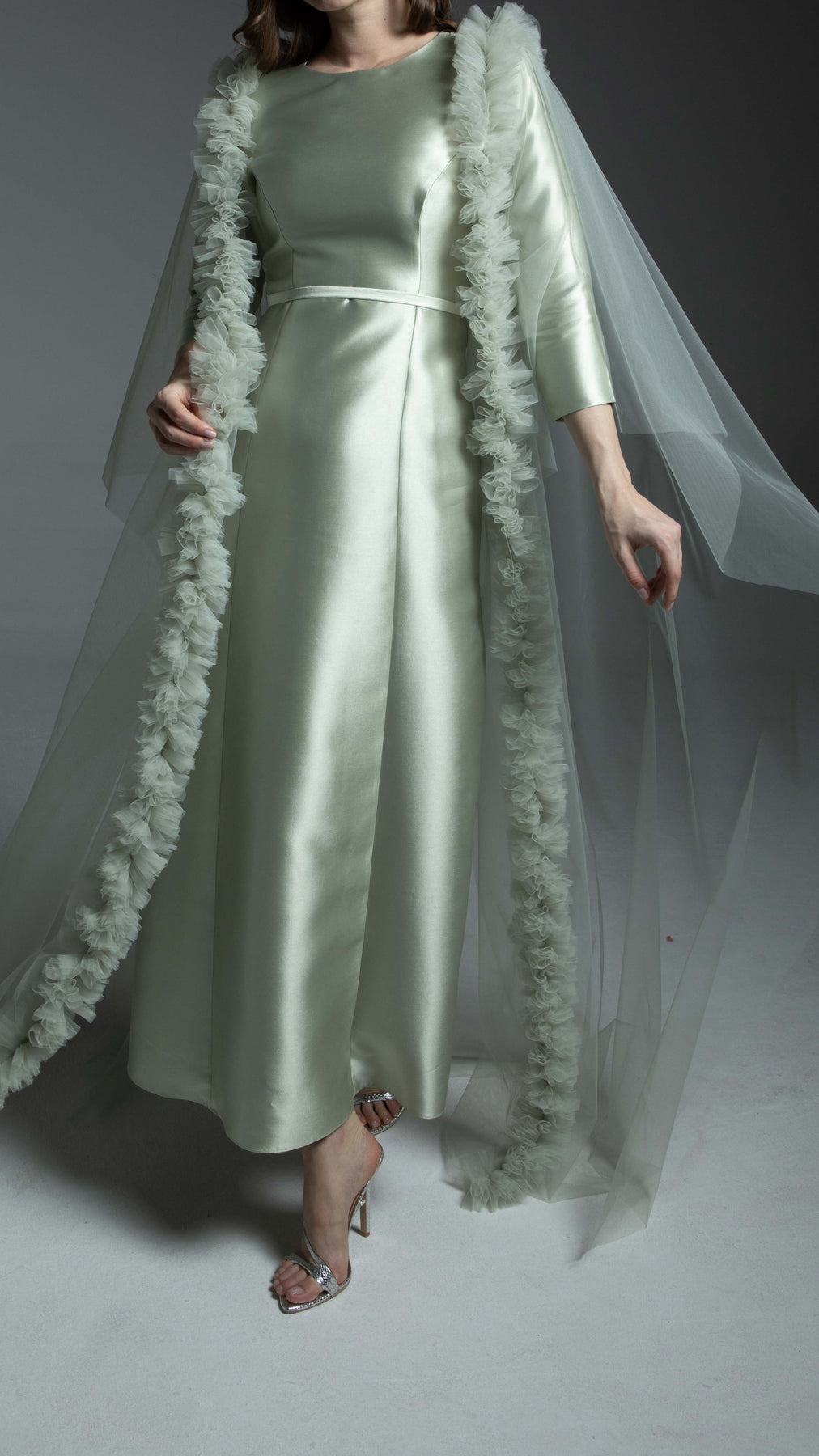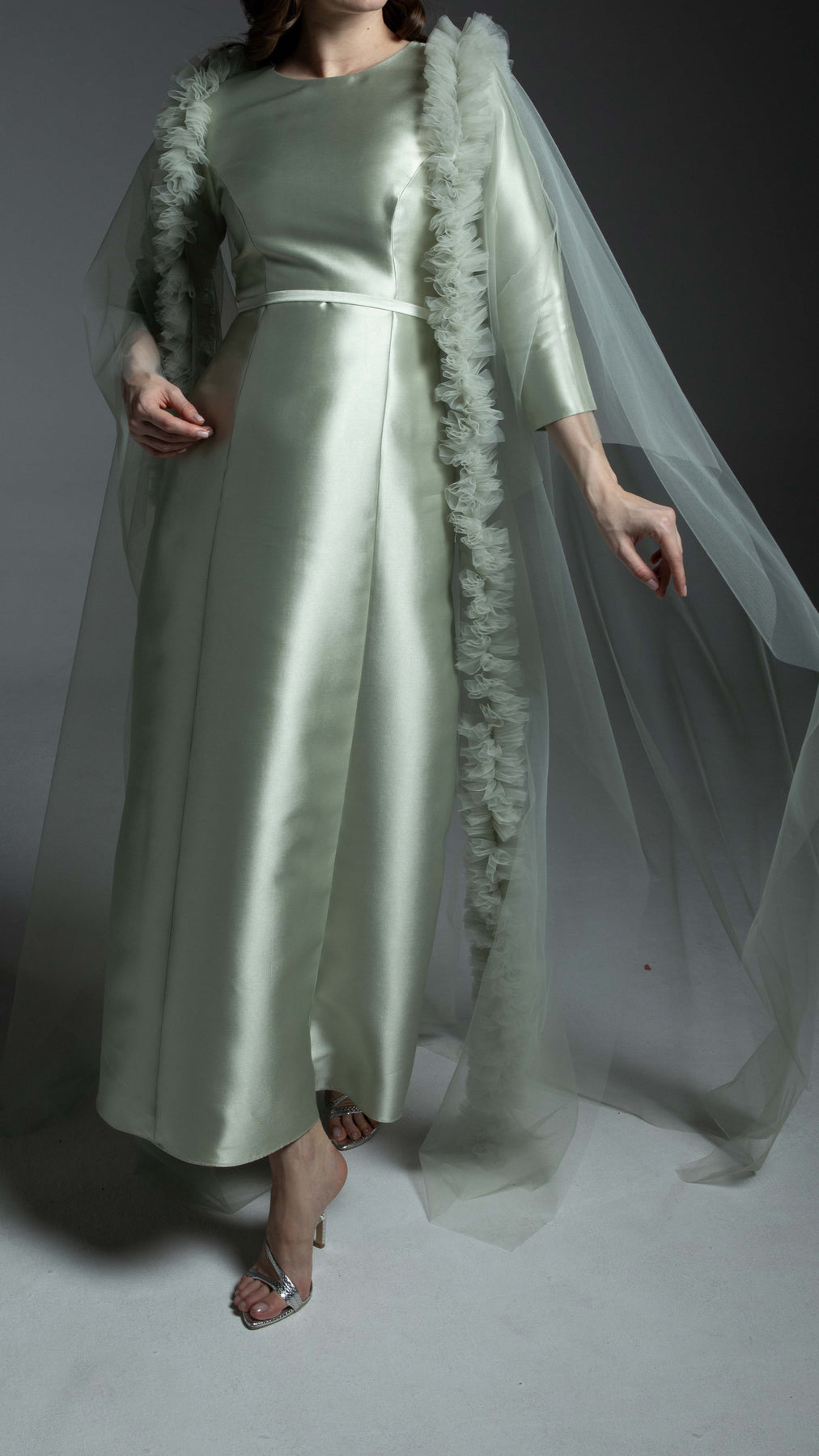 The Body fit long dress is made from luxurious Mikado Satin, offering a beautiful sheen and tailoring that is softened by the airy, detachable cape. The Separate Cape is adorned with delicate tulle ruffles on the front, creating flattering volume and dynamic movement. Features a timeless Round Shape neck and elegant 3/4 length Sleeves. Includes a separate belt to customize the waistline and enhance the tailored silhouette.