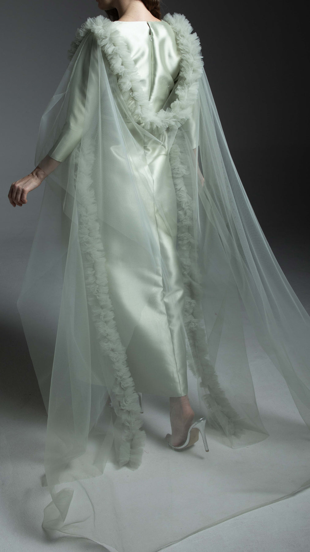•    Detail: Plain dress; Cape design with tulle ruffles on the front.