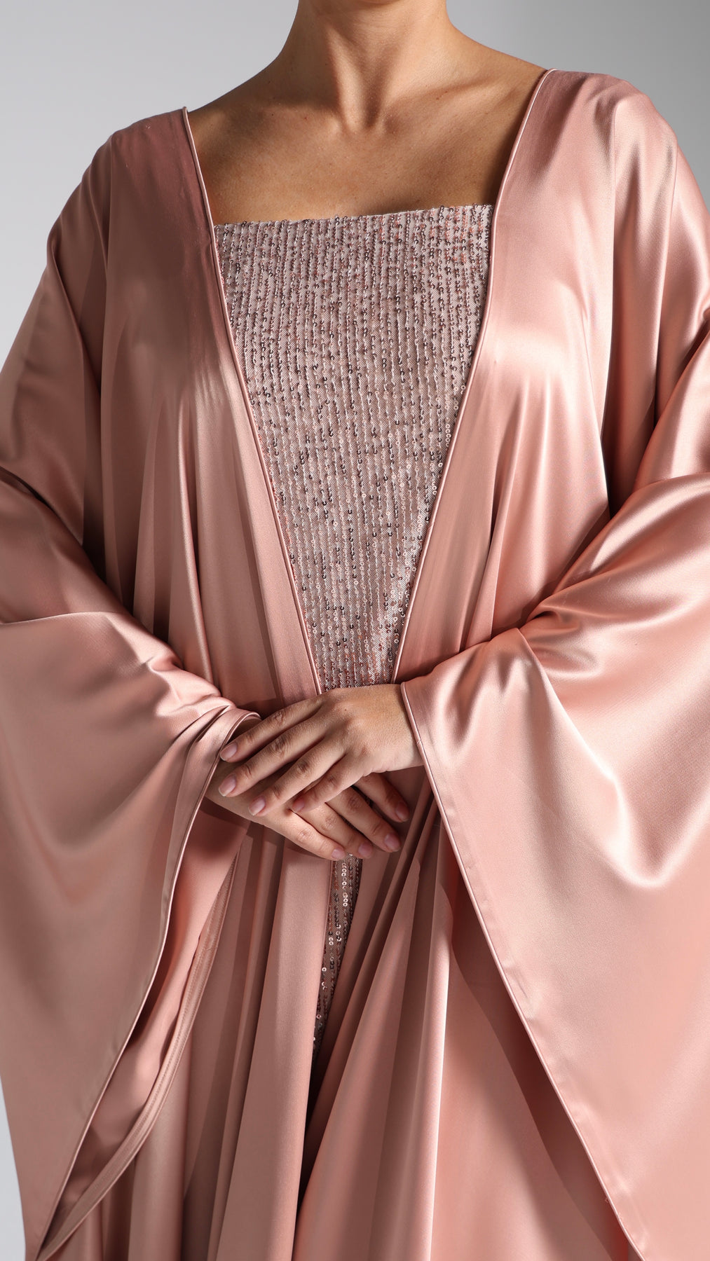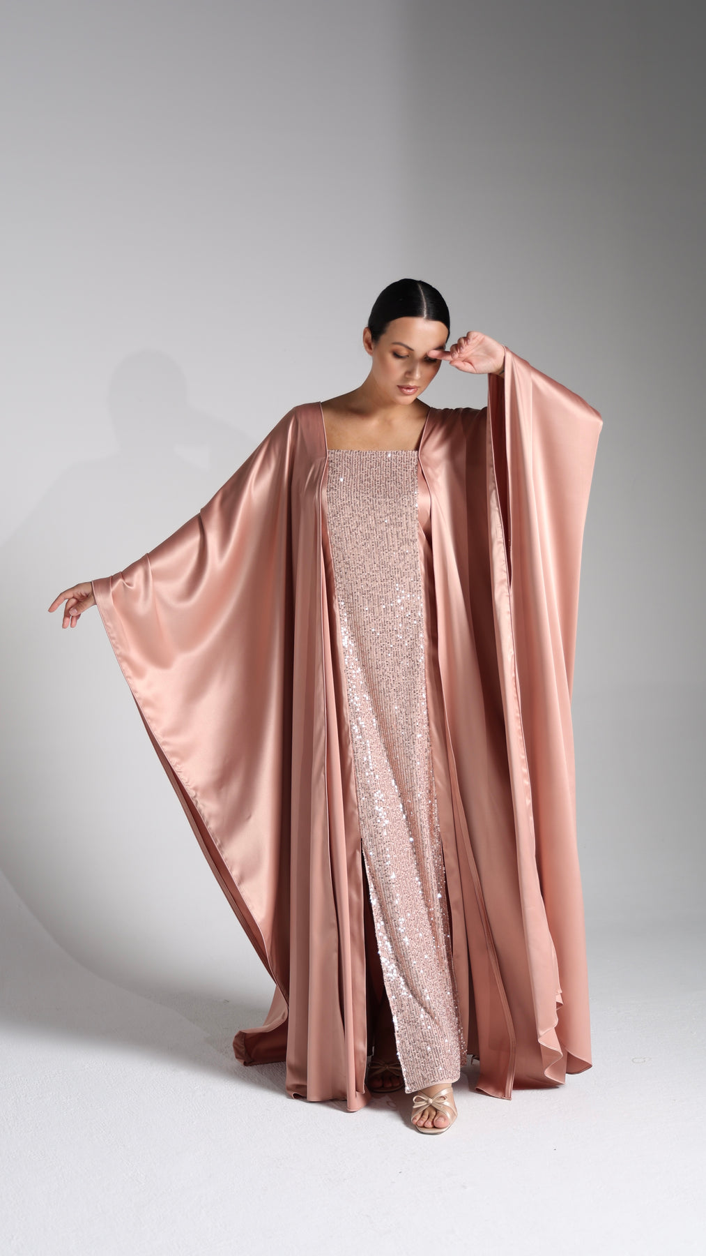 Step into the spotlight with our Aurora Rose Gold Set, a masterpiece of modern modest fashion. This ensemble features a luxurious Swish satin with an
