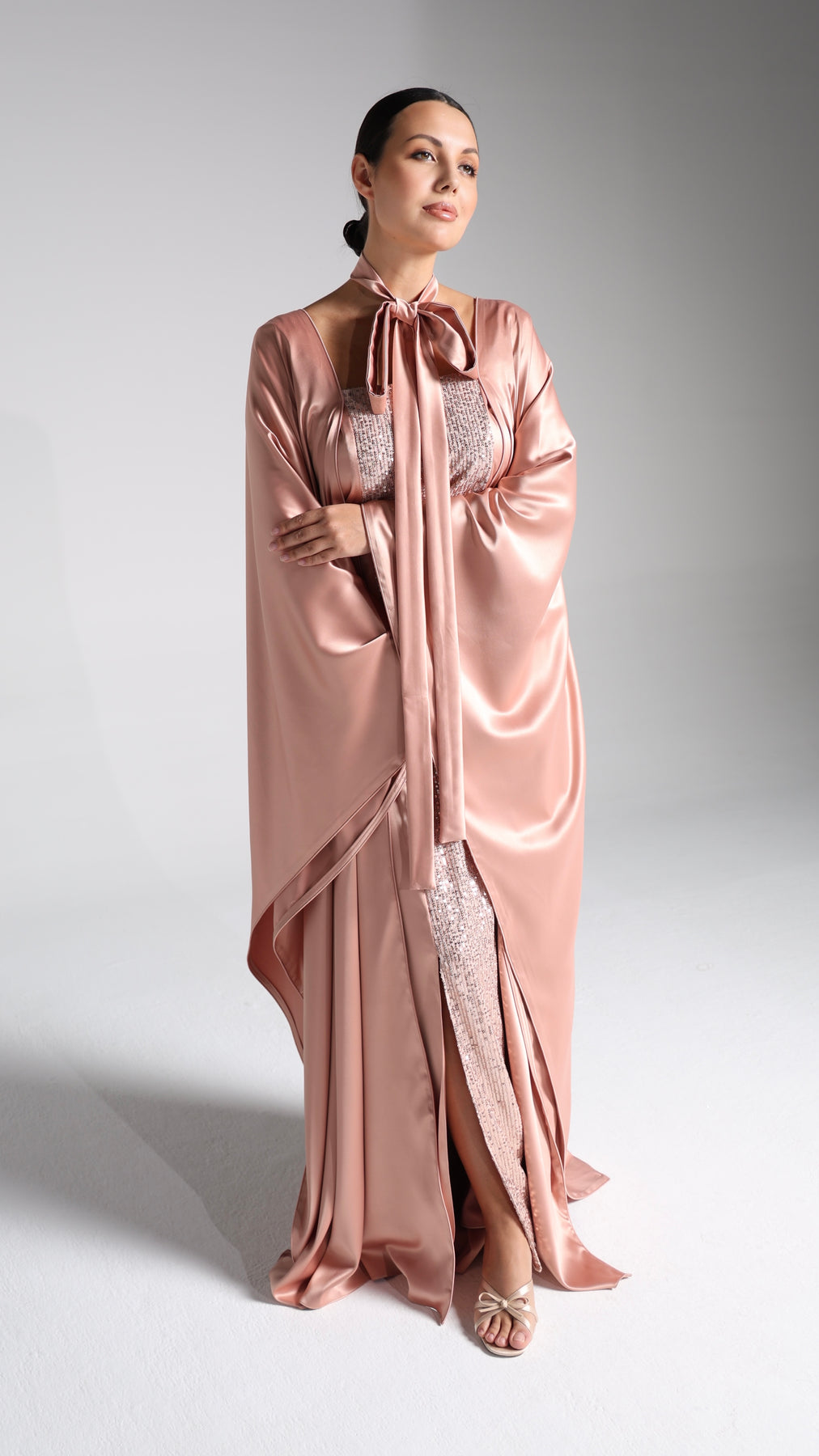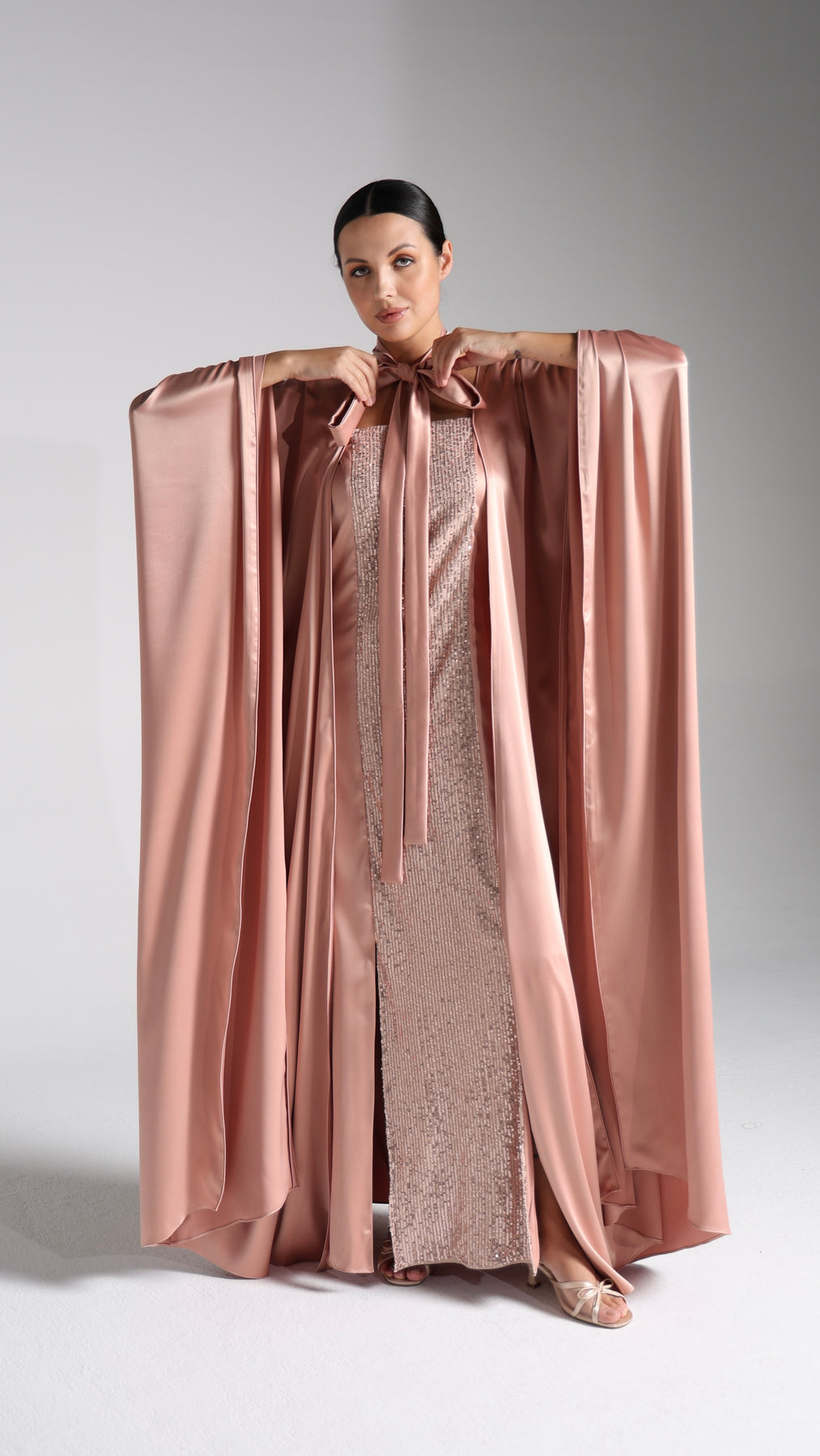 ethereal, floor-length drape and dramatic open sleeves. Underneath, a fully sequined dress catches the light from every angle, creating a shimmering rose