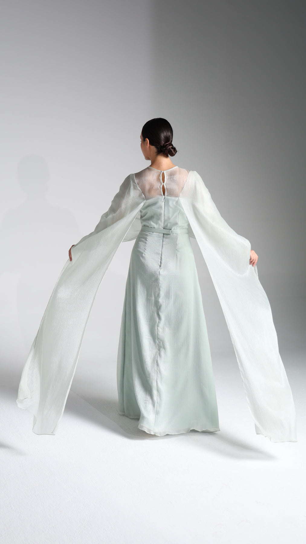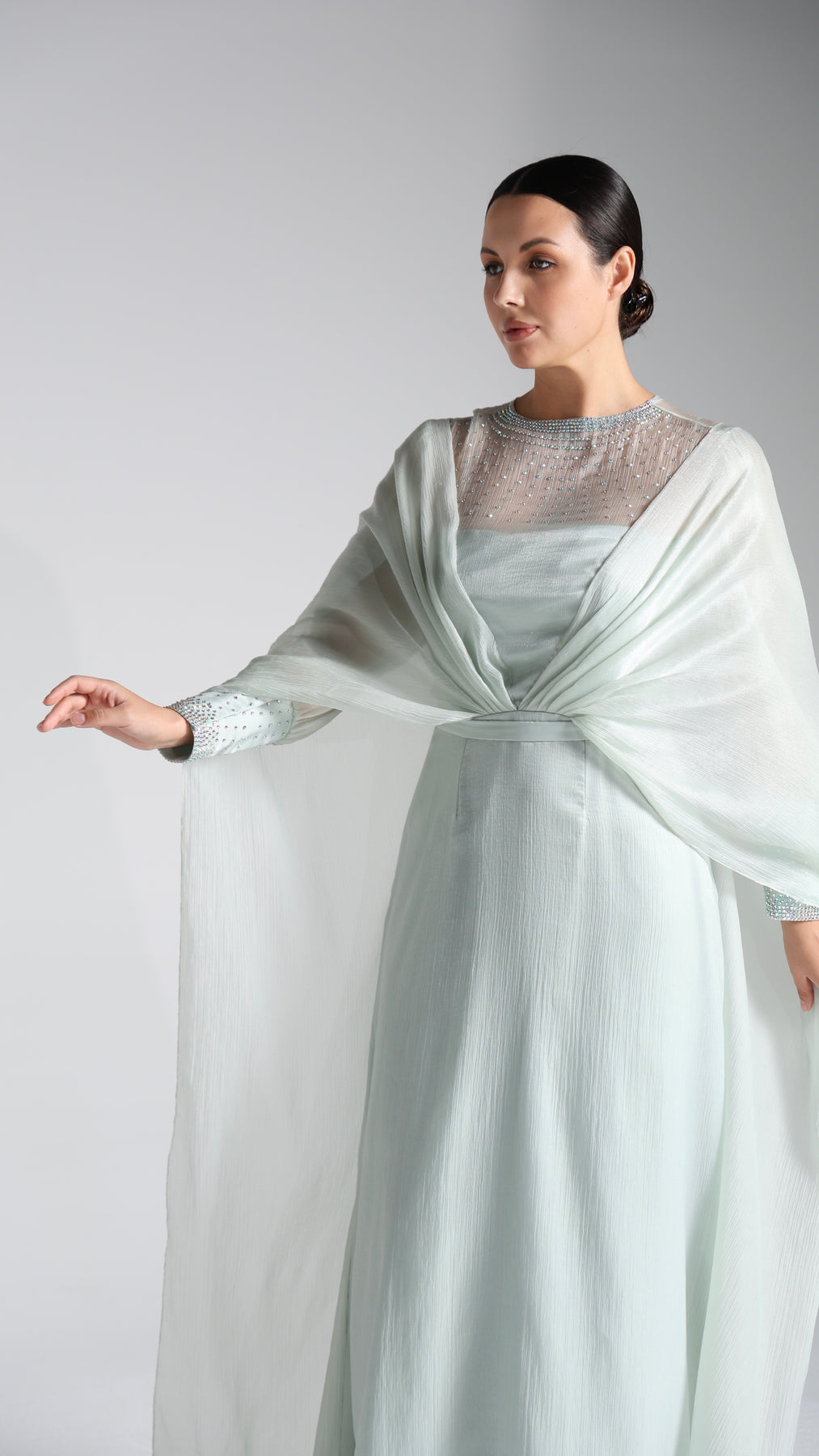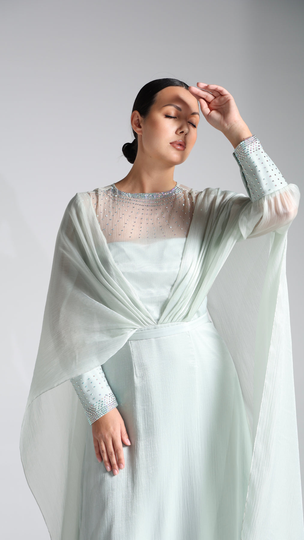 A centerpiece of the collection, this gown is a study in "Quiet Luxury." It features a masterful Grecian-inspired wrap that creates a sense of effortless, flowing grace, perfectly capturing the purity of the Ramadan spirit.