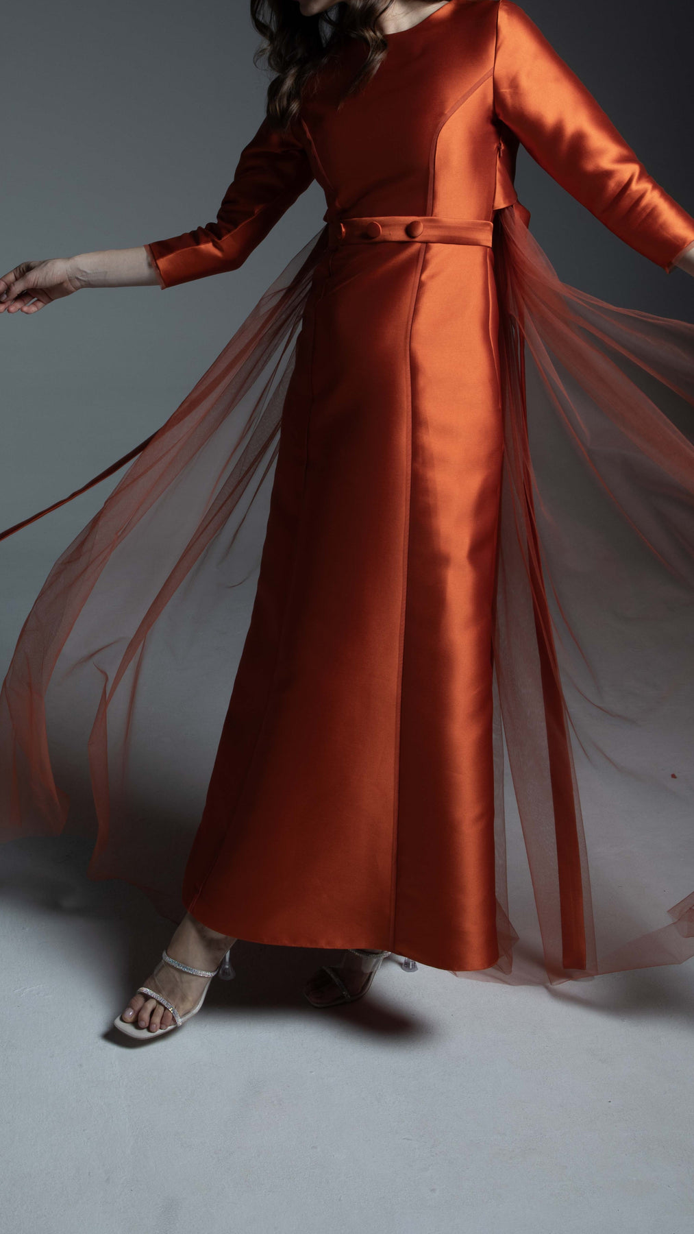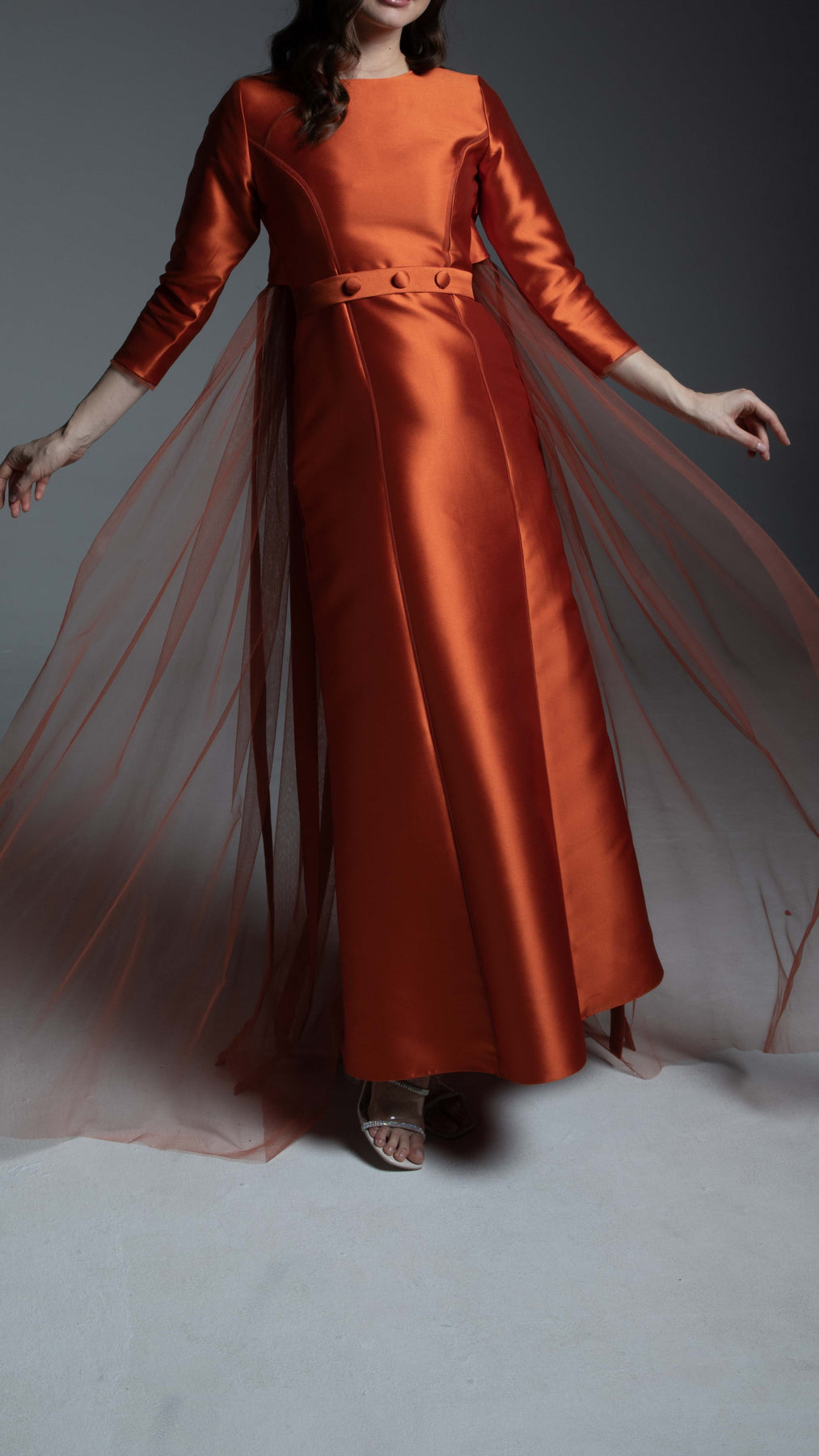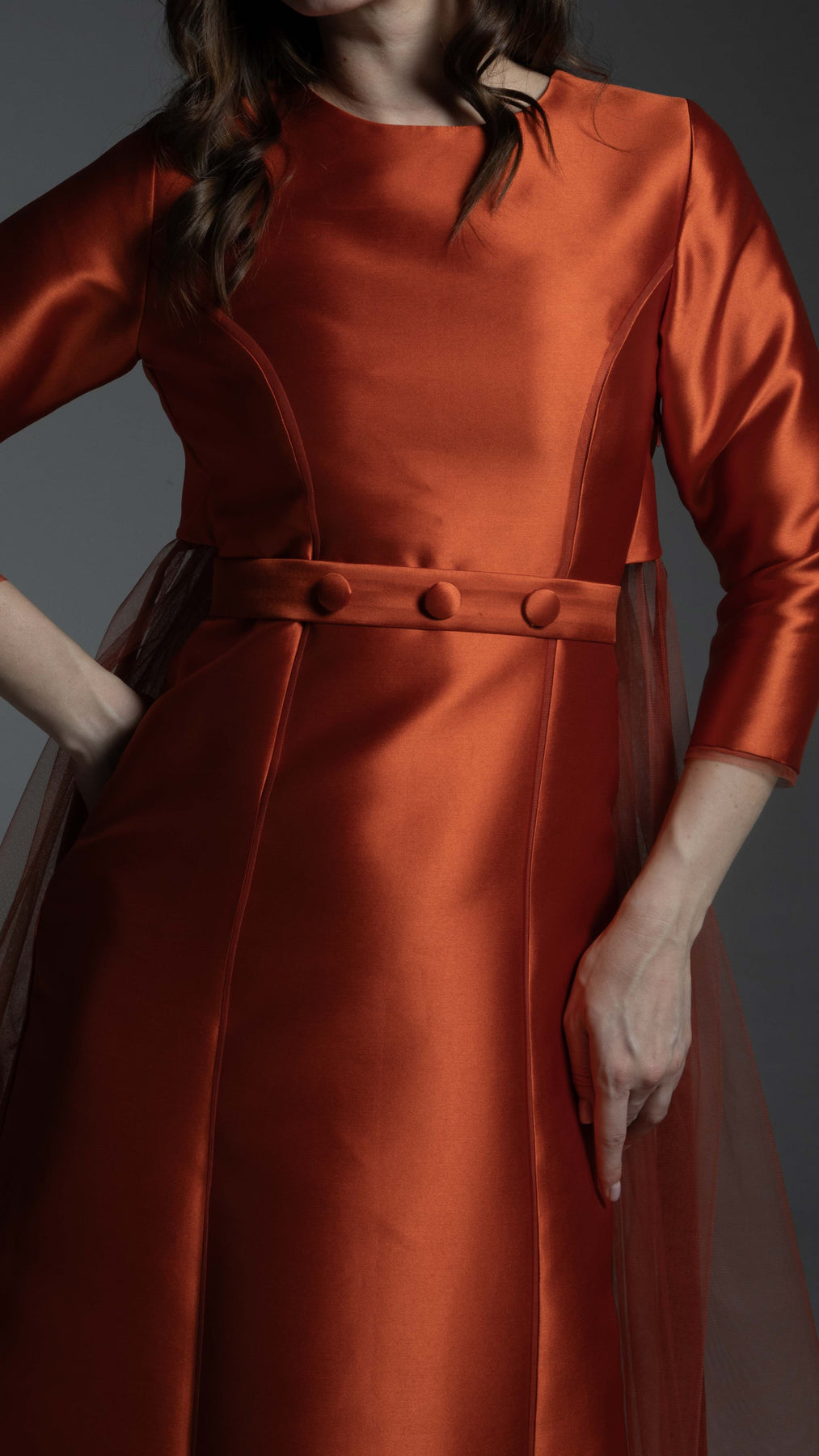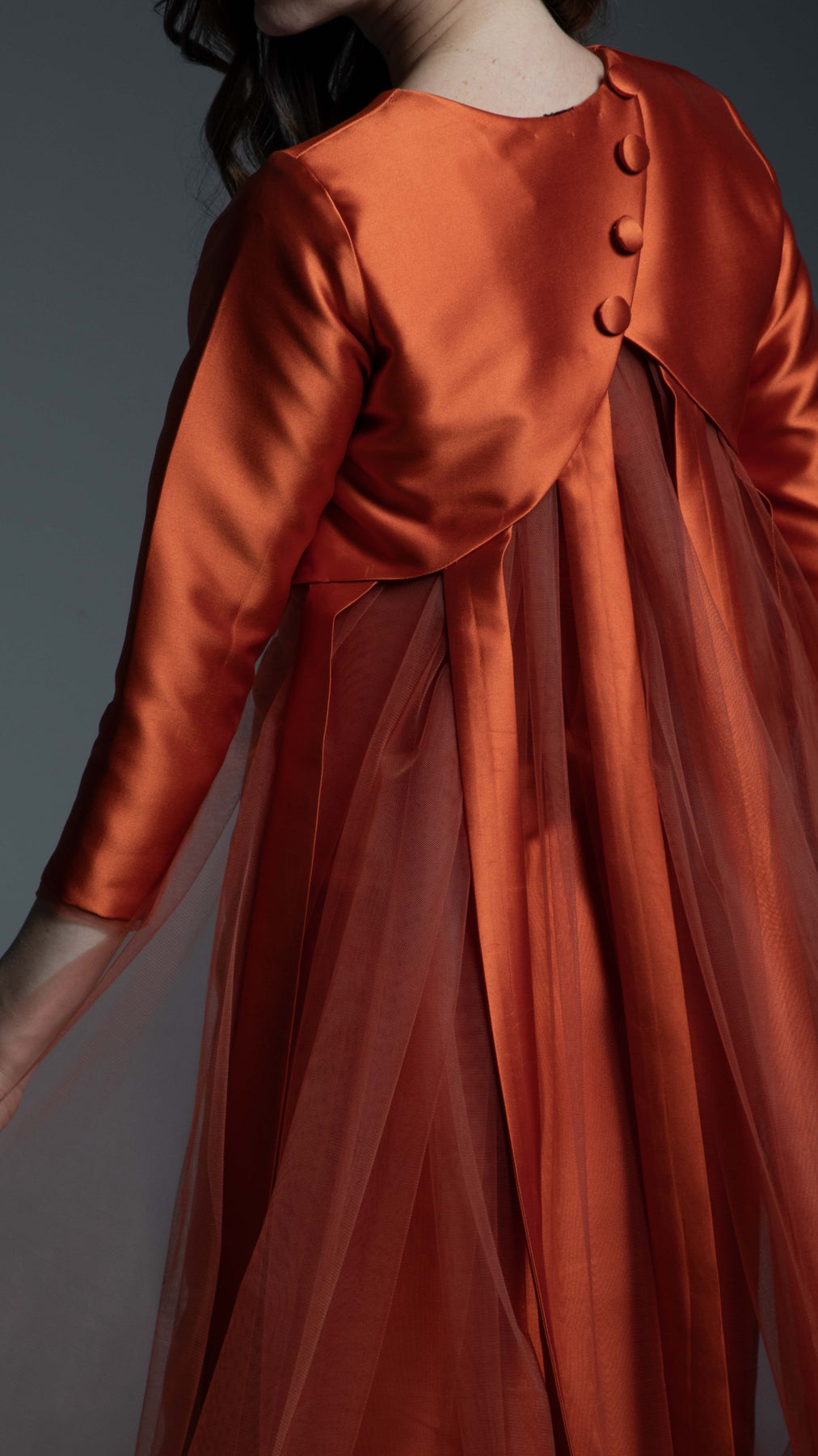 The gown's front showcases a clean, tailored aesthetic with a precision fitting line. This line is accentuated by a discreet tulle border inside, adding a subtle layer of depth. It features a classic Round Shape neck and elegant 3/4 length sleeves for timeless appeal. The back is where the magic happens, offering intricate, architectural detail. The back dress design features six vertical lines, creating a beautiful, slimming paneling effect. This structured back is softened by tulle gathering, providing a delicate, cloud-like texture and beautiful movement. The back neckline is completed with four polished U-buttons, embellished to add a refined, jewel-like finish.